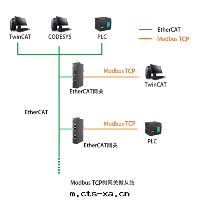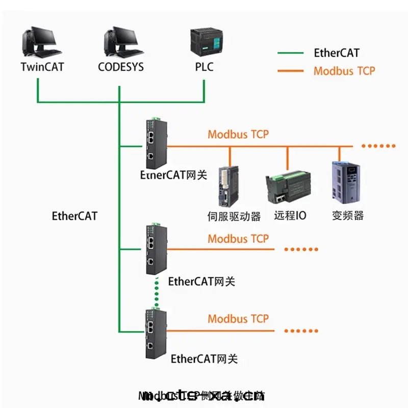 本产品是(shì)EtherCAT和(hé)Modbus TCP网(wǎng)關(guān),使用(yòng)數據(jù)映射方(fāng)式工作(zuò)。 本产品在(zài)EtherCAT側作(zuò)为(wèi)EtherCAT從站,接TwinCAT、CodeSYS、PLC等;在(zài)ModbusTCP側做为(wèi)ModbusTCP主(zhǔ)站(Client)或從站(Server),接ModbusTCP從站如(rú)變(biàn)頻器、流量(liàng)計(jì)、温(wēn)度(dù)采集模块(kuài)等,或者(zhě)接ModbusTCP主(zhǔ)站如(rú)PLC、上(shàng)位(wèi)機(jī)等。