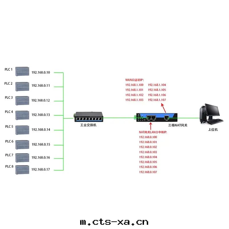 SG-NAT-410网(wǎng)關(guān)支持(chí) IP 地(dì)址跨网(wǎng)段(duàn)和(hé)通(tòng)訊端口(kǒu)的轉(zhuǎn)换,为(wèi)不(bù)方(fāng)便修改參數的以(yǐ)太网(wǎng)通(tòng)訊設備的信(xìn)息化(huà)联网(wǎng)提(tí)供便捷的解(jiě)決方(fāng)案。网(wǎng)關(guān)有(yǒu)1个(gè)两(liǎng)口(kǒu)以(yǐ)太网(wǎng)交换機(jī)接口(kǒu)(LAN口(kǒu))和(hé)1个(gè)單口(kǒu)以(yǐ)太网(wǎng)通(tòng)訊接口(kǒu)(WAN口(kǒu))。不(bù)对(duì)原系(xì)统做任何硬(yìng)件(jiàn)和(hé)软(ruǎn)件(jiàn)修改,不(bù)影響原系(xì)统通(tòng)訊,一(yī)台(tái)SG-NAT-410最(zuì)多(duō)可(kě)以(yǐ)實(shí)現(xiàn)8个(gè)設備的 IP 地(dì)址和(hé)通(tòng)訊端口(kǒu)的轉(zhuǎn)换。