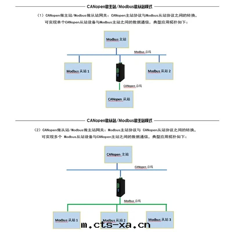 (1)CANopen 做主(zhǔ)站/Modbus 做從站网(wǎng)關(guān):CANopen 主(zhǔ)站協議與(yǔ) Modbus 從站協議之(zhī)間(jiān)的轉(zhuǎn)换,可(kě)實(shí)現(xiàn)單个(gè) CANopen 從站設備與(yǔ) Modbus 主(zhǔ)站之(zhī)間(jiān)的數 據(jù)通(tòng)信(xìn)。 (2)CANopen 做從站/Modbus 做主(zhǔ)站网(wǎng)關(guān):Modbus 主(zhǔ)站協議與(yǔ) CANopen 從站協議之(zhī)間(jiān)的轉(zhuǎn)换,可(kě)實(shí)現(xiàn)多(duō)个(gè) Modbus 從站設備與(yǔ) CANopen 主(zhǔ)站之(zhī)間(jiān)的數據(jù)通(tòng)信(xìn)。