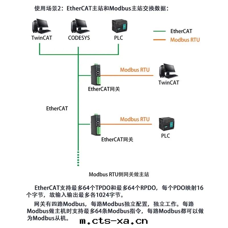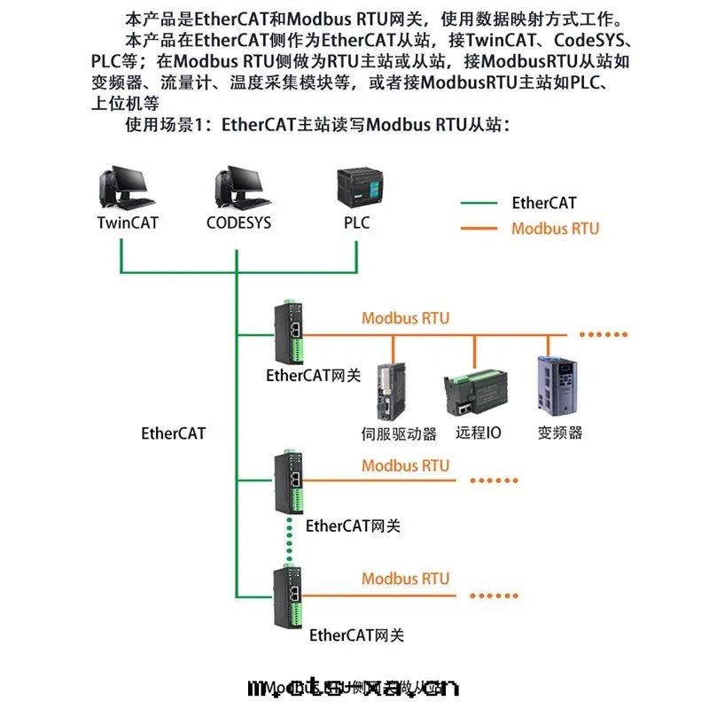 本产品是(shì) EtherCAT 和(hé) Modbus RTU 网(wǎng)關(guān),使用(yòng)數據(jù)映射方(fāng)式工作(zuò)。本产品在(zài) EtherCAT 側作(zuò)为(wèi) EtherCAT 從站,接 TwinCAT、CodeSYS、PLC等;在(zài) Modbus RTU 側做为(wèi) RTU 主(zhǔ)站或從站,接 ModbusRTU 從站如(rú)變(biàn)頻器、流量(liàng)計(jì)、温(wēn)度(dù)采集模块(kuài)等,或者(zhě)接 ModbusRTU 主(zhǔ)站如(rú)PLC、上(shàng)位(wèi)機(jī)等。