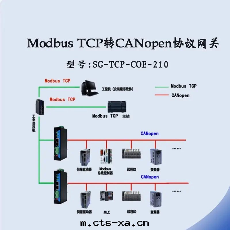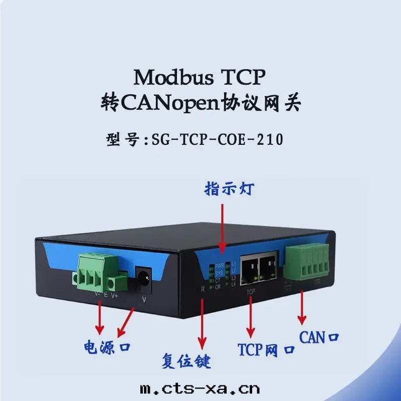 SG-TCP-COE-210 网(wǎng)關(guān)可(kě)以(yǐ)實(shí)現(xiàn)将 CANOpen 接口(kǒu)設備連(lián)接到 MODBUSTCP 网(wǎng)絡中(zhōng)。用(yòng)户不(bù)需要了(le)解(jiě)具體(tǐ)的 CANOpen 和(hé) Modbus TCP 協議即可(kě)實(shí)現(xiàn)将CANOpen 設備挂载(zài)到 MODBUS TCP 接口(kǒu)的 PLC 上(shàng),並(bìng)和(hé) CANOpen 設備進(jìn)行數據(jù)交互。