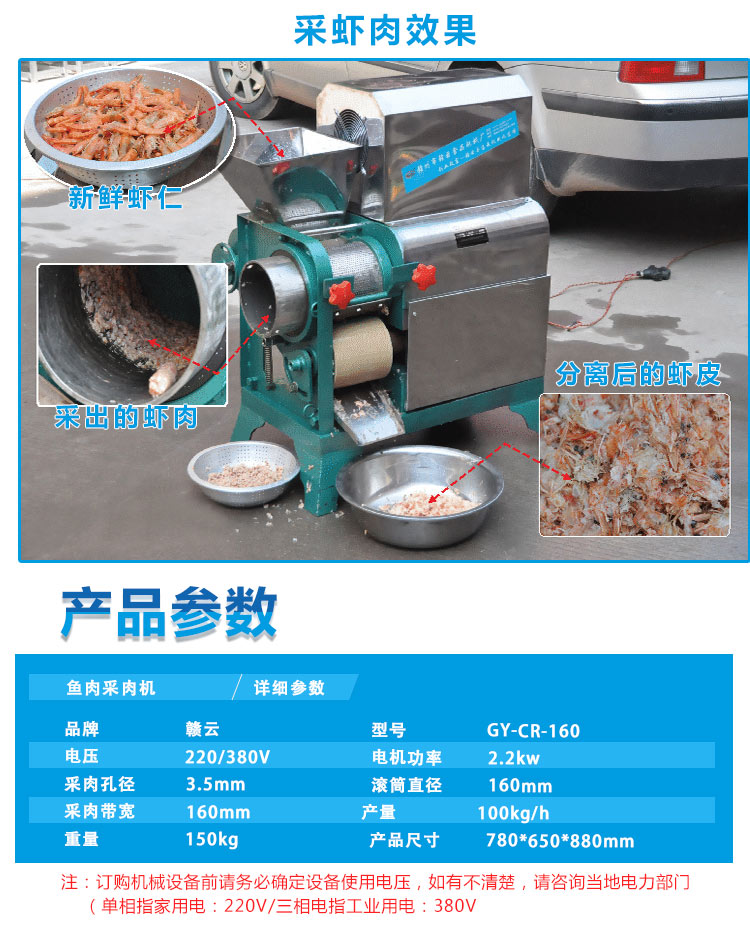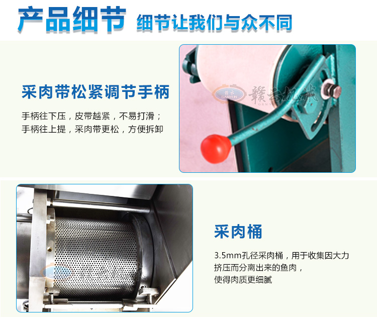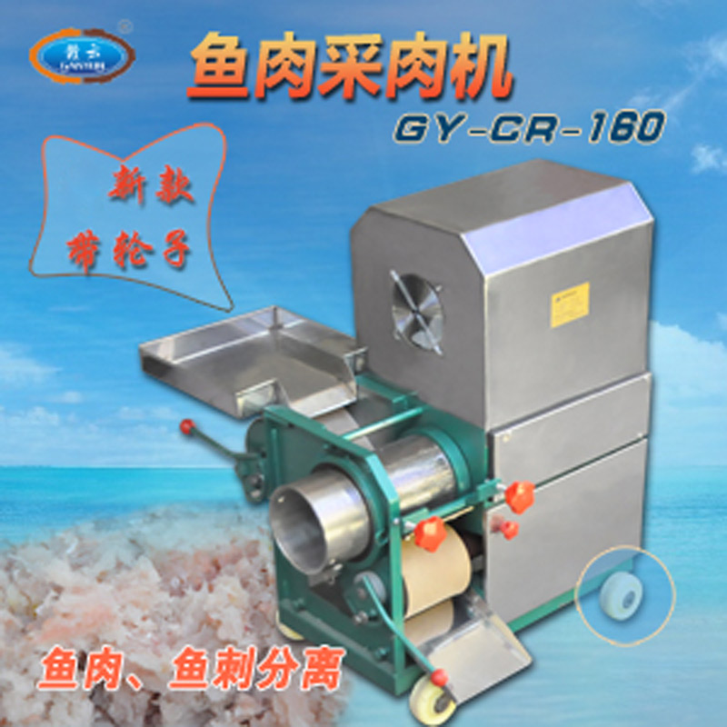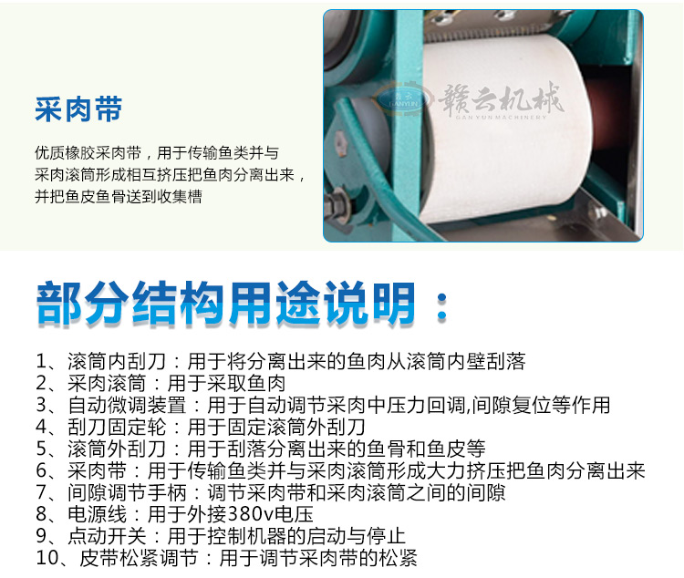 贛云牌新品普通款魚肉采肉機(jī)160型帶輪子,便于移動,魚肉魚刺分離原理:切好的魚小塊(整蝦、小蟹、小魚等)通過采肉帶輸送至采肉滾筒與采肉帶間隙,兩則相對滾動產(chǎn)生大力擠壓將魚肉擠入采肉滾筒內(nèi),魚刺和魚皮、魚鱗等因采肉滾筒壁小孔直徑只有3.5mm而無法進(jìn)入,被滾筒外刮刀刮落,完成魚肉與魚骨、魚皮、魚鱗的分離。