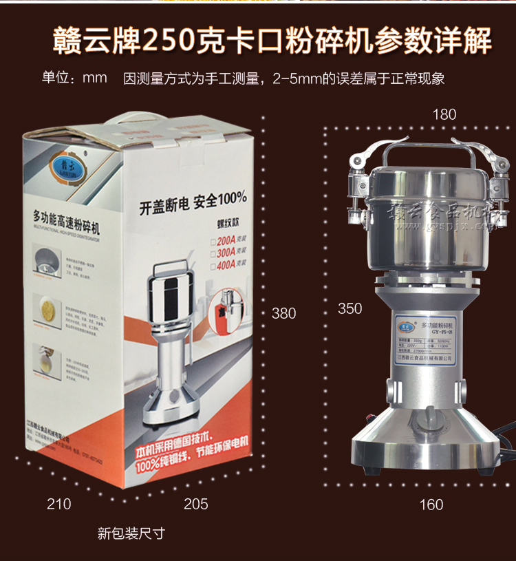 贛云系列多功能粉碎機采用純銅高速電機帶動粉碎刀片將物料快速打成粉末,可用于粉碎五谷、雜糧、田七、阿膠、白叁等,一般粉碎時間1-2分鐘即可,新款粉碎機改保險絲為空氣過載保護器,使用更安全,我廠提供的粉碎機有100克-1000克不同型號的多功能粉碎機。