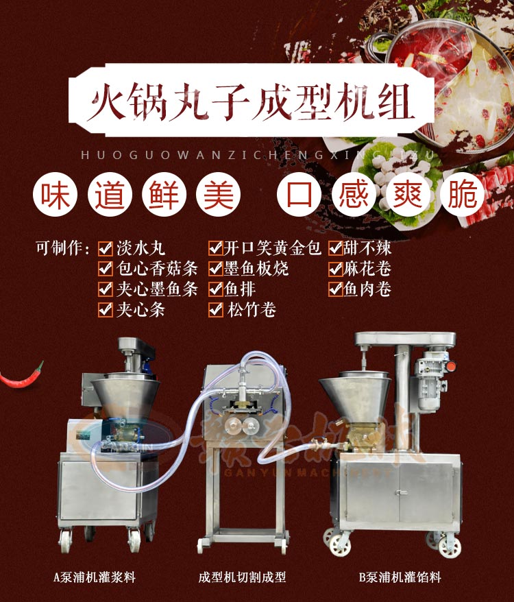 多功能火鍋料組合成型機組是由兩臺泵浦機和一臺火鍋料成型機組合而成,泵浦機起灌漿作用,火鍋料成型機起成型作用,本套成型機組可成型多種規(guī)格丸子,多種不同花色的丸子,又可稱為多樣丸子機,花樣丸子機,單色丸子機,多色丸子機等等。