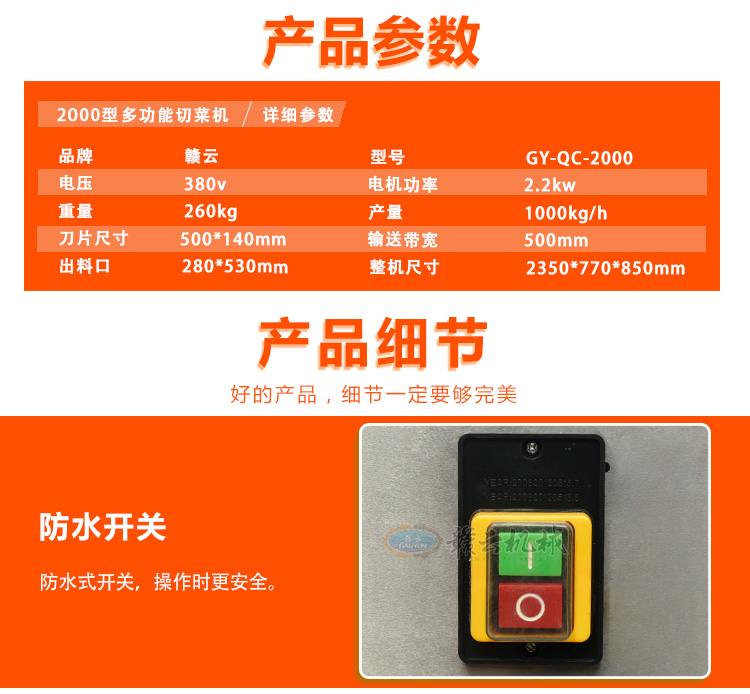 由于切菜技術(shù)的不斷改進(jìn),產(chǎn)品款式也會(huì)不斷的更新,以下是前幾天客戶定制的GY-QC-2000型多功能切菜機(jī)的詳細(xì)技術(shù)參數(shù)和高清細(xì)節(jié)圖。