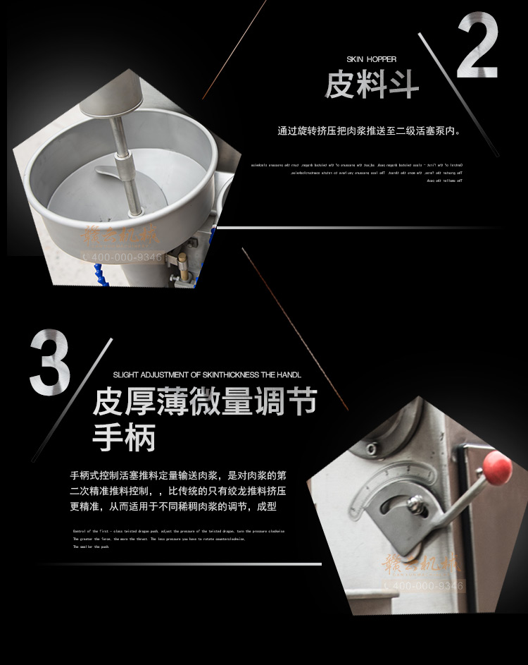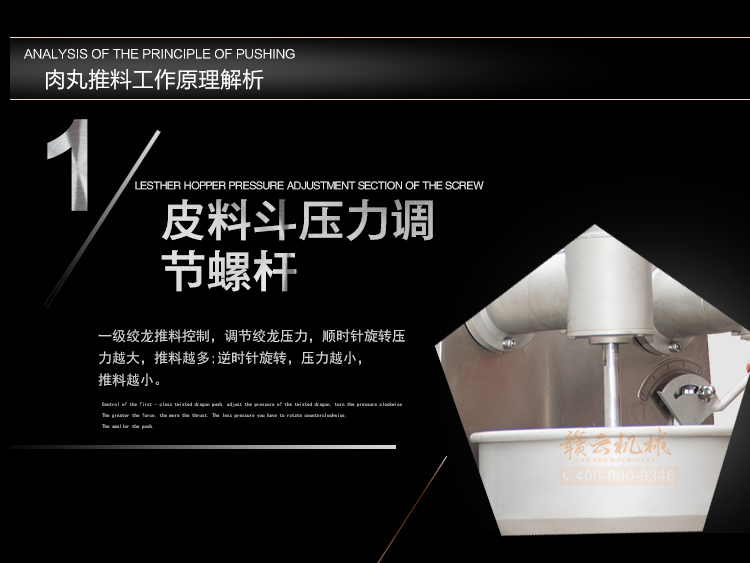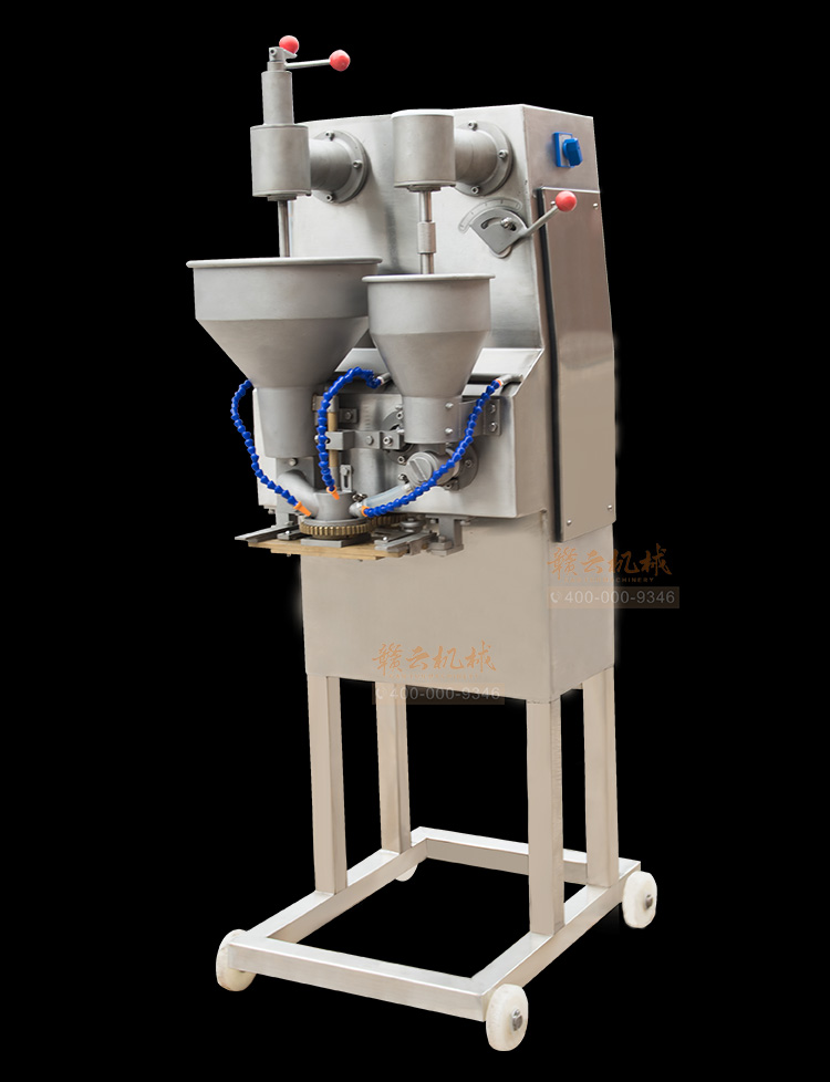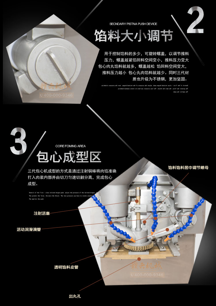 第三代包心肉丸機是在贛云二代包心肉丸機的基礎上,對二代包心機的成型切割部位進行優(yōu)化提速處理,達到每分鐘200粒的成型速度是二代包心機的兩倍,且推料控制方式還是選用一級絞龍推料和二次泵定量輸送相結合的原理,餡料控制改塑料螺蓋為不銹鋼抗氧化特殊處理螺蓋,餡斗新增絞龍擋板,可有效防止肉餡余留餡斗,更易肉餡的向下擠壓輸送作用,成型旋轉齒輪上新增潤滑滴管,彌補了二代包心機成型區(qū)域局部潤滑切刀的缺陷,做出的包心包餡丸表皮光滑,個體圓且大,成型速度快,無小尾巴等優(yōu)勢。綜上優(yōu)勢pk二代和目前其他廠家新款式包心肉丸機,故稱之為贛云第三代包心肉丸機!