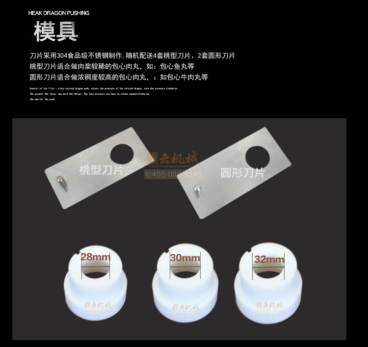 成型模具:28mm、30mm、32mm三種規(guī)格,其他規(guī)格可定做。本機可生產(chǎn)直徑為28mm-36mm直徑的包心丸子,因此定做的規(guī)格直徑不能超過36mm,也不能低于28mm.