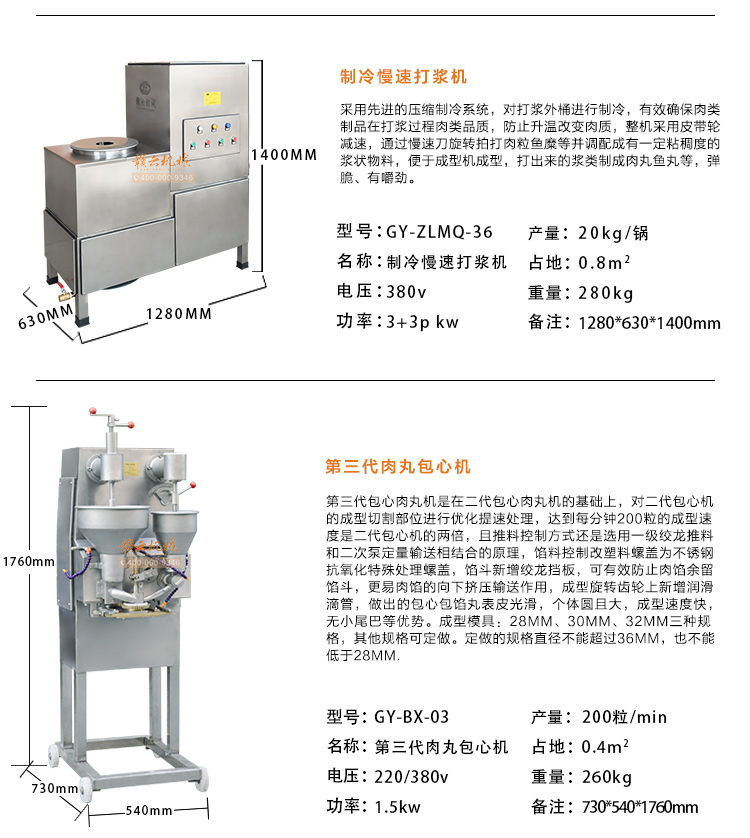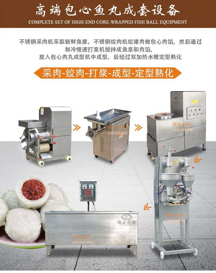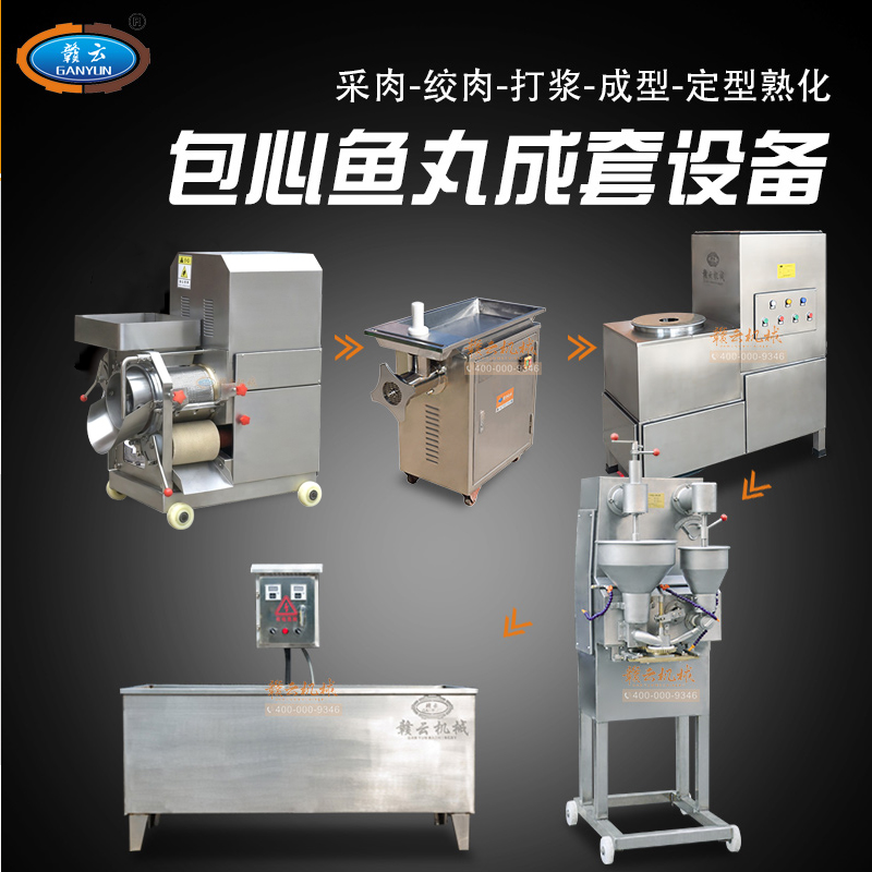本套設(shè)備由:200型全不銹鋼魚肉采肉機(jī)、32型立式不銹鋼絞肉機(jī)、36型制冷慢速肉丸打漿機(jī)、三代肉丸包心機(jī)和智能溫控雙加熱水槽六臺(tái)設(shè)備組合而成。本套設(shè)備除了可以生產(chǎn)包心魚丸,還可生產(chǎn)實(shí)心魚丸