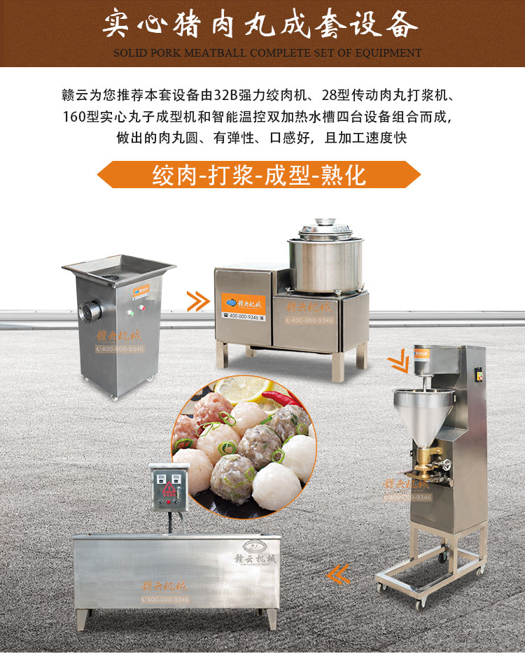 贛云2016新推出實(shí)用實(shí)心豬肉丸成套設(shè)備,本套設(shè)備采用:32B型不銹鋼強(qiáng)力絞肉機(jī)、28B型全封閉高速肉丸打漿機(jī)、160型加高肉丸成型機(jī)和1500型智能溫控雙加熱水槽。詳細(xì)參數(shù)如下