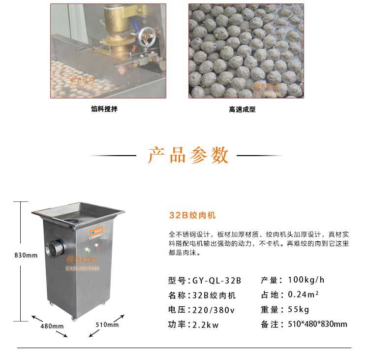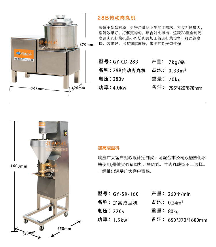 本套設(shè)備有:32B型強(qiáng)力絞肉機(jī)、28型傳動(dòng)式高速肉丸打漿機(jī)、 160型實(shí)心丸子成型機(jī)和雙槽加熱水槽四臺(tái)設(shè)備組合而成,均是目前市上新款式設(shè)備,效果突出,做出的肉丸圓、有彈性、口感好,加工速度快等特點(diǎn)深受豬肉丸丸子加工客戶睞,500KG左右。