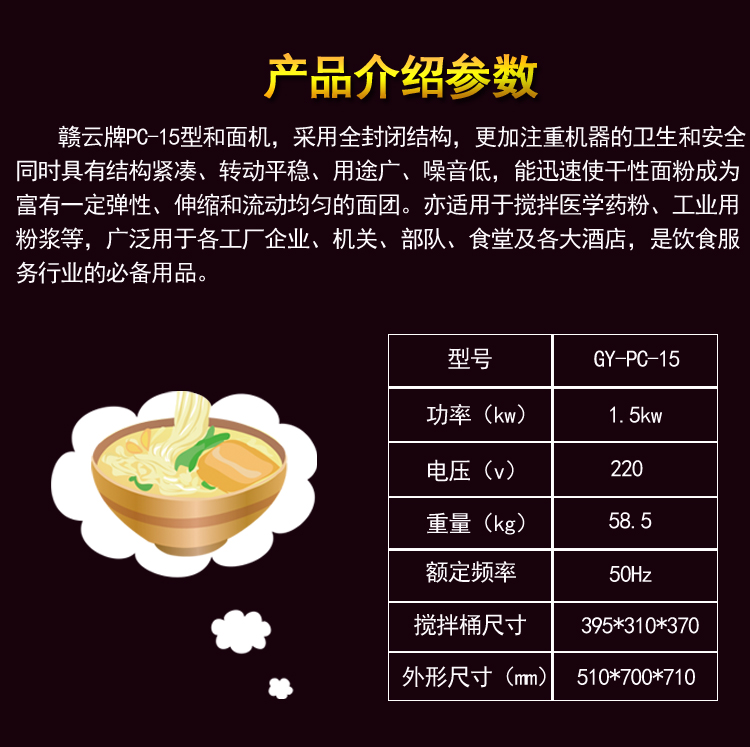 贛云牌PC-15型和面機,采用全封閉結(jié)構(gòu),更加注重機器的衛(wèi)生和安全同時具有結(jié)構(gòu)湊、轉(zhuǎn)動平穩(wěn)、用途廣、噪音低,能迅速使干性面粉成為富有一定彈性、伸縮和流動均勻的面團。亦適用于攪拌醫(yī)學(xué)藥粉、工業(yè)用粉漿等,廣泛用于各工廠企業(yè)、機關(guān)、部隊、食堂及各大酒店,是飲食服務(wù)行業(yè)的必備用品。