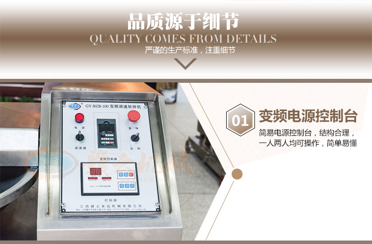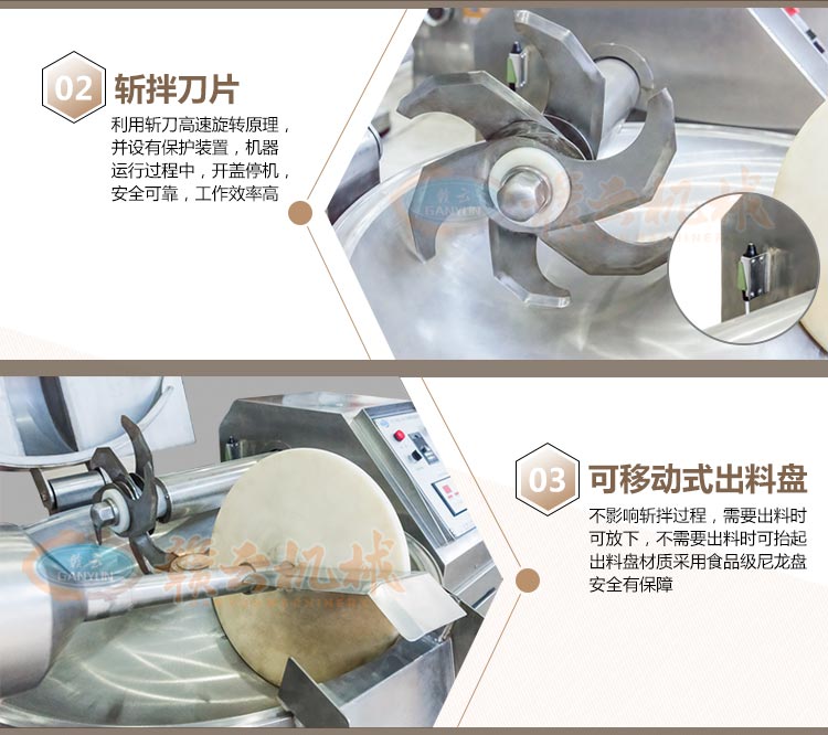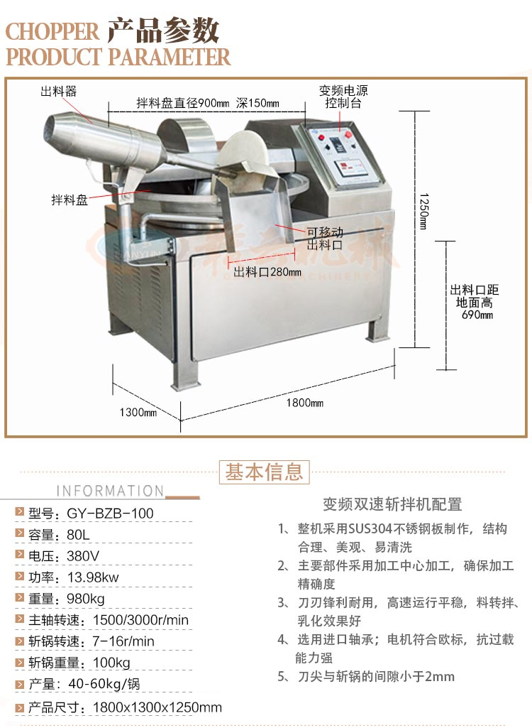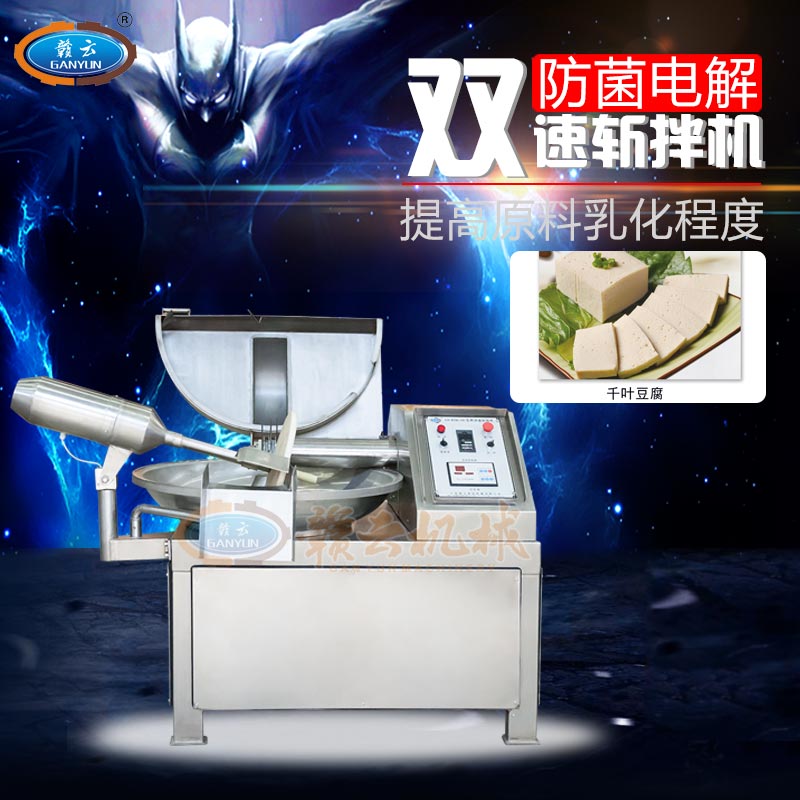 斬拌機是肉類制品生產(chǎn)制作工藝中的一個關(guān)鍵設(shè)備,斬刀的高速旋轉(zhuǎn)將原料斬碎,同時料鍋的旋轉(zhuǎn)使原料斬拌均勻。適用于制作腸類、丸類等肉制品加工設(shè)備,它不僅能將塊狀原料精細的切碎,還能同時將其它的原料,如水、調(diào)味品等附加原料一起攪拌成均勻的乳狀物,提高原料的乳化程度,且不會出現(xiàn)拖油現(xiàn)象,對改善產(chǎn)品的口感,提高產(chǎn)品的出品率起到了關(guān)鍵的作用。適用范圍:廣泛應用于蔬菜加工、肉類加工、豆制品加工等,是生產(chǎn)肉丸,烤腸類、千頁豆腐、魚豆腐,餡料斬切加工,雞蛋干制作等的推薦設(shè)備。