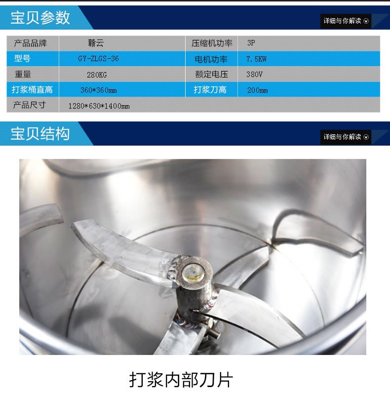 36型高速制冷打漿機(jī)技術(shù)參數(shù):打漿桶直徑360mm ,外觀和大小與36型慢速制冷打漿機(jī)是一樣的,電機(jī)功率7.5kw  壓縮機(jī)功率3P。