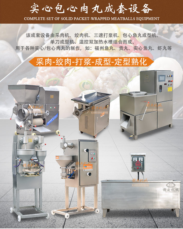 實(shí)心肉丸成套設(shè)備,包心肉丸成套設(shè)備一體組合,能生產(chǎn)新鮮各式實(shí)心肉丸,包心肉丸,如實(shí)心豬肉丸、魚(yú)丸,潮汕牛肉丸,蝦丸蟹丸等各種實(shí)心丸子,及福州魚(yú)丸、包心豬肉丸,包心牛肉丸等各式包心肉丸等,本套設(shè)備有絞肉機(jī)、采肉機(jī)、制冷三速打漿機(jī)、單刀高速多功能成型機(jī)、包心肉丸成型機(jī)和熟化水槽。