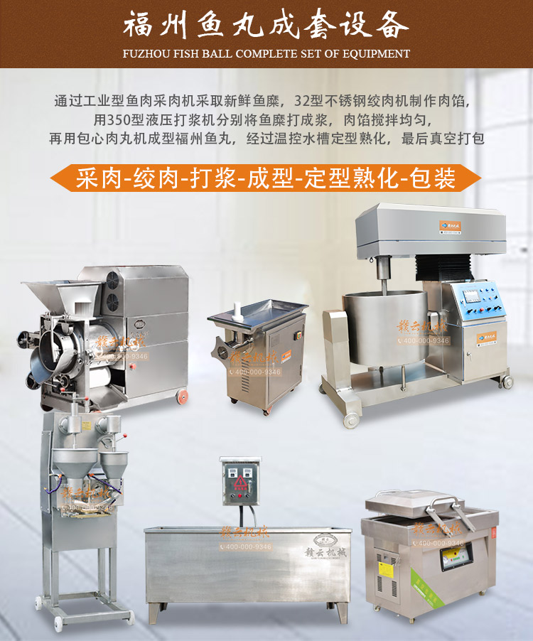福州魚丸成套設(shè)備,時(shí)產(chǎn)500kg配套組合,采用新鮮淡水魚或海魚為原料加工,通過350工業(yè)型魚肉采肉機(jī)采取新鮮魚糜,用350型液壓打漿機(jī)調(diào)制成漿,32型不銹鋼絞肉機(jī)制作肉餡,用第三代包心肉丸機(jī)成型福州魚丸,后經(jīng)過熟化定型水槽定型熟化