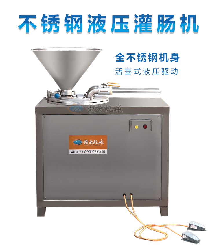 贛云食品機(jī)械旗下液壓灌腸機(jī),新款灌漿制腸,此款雙管灌腸機(jī)采用液壓灌漿推料原理設(shè)計(jì),設(shè)備密封性能良好,配合雙管灌漿提高灌腸產(chǎn)量,設(shè)備可自動(dòng)調(diào)節(jié)灌漿,自動(dòng)吸料,腳踏開關(guān)控制讓人操縱自如。是一款實(shí)用的灌漿制腸設(shè)備。 注意事項(xiàng):首次使用前必須加入一桶16KG的46#液壓油