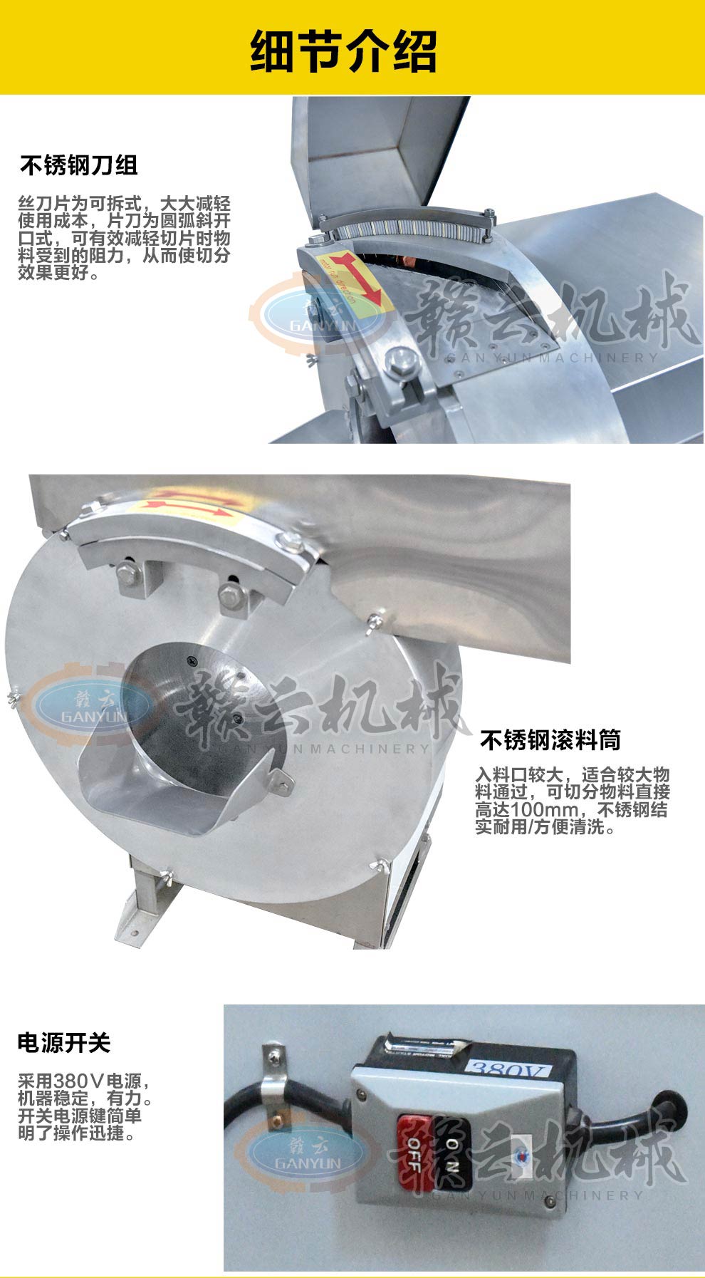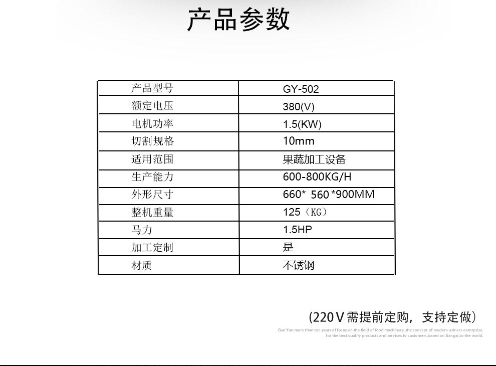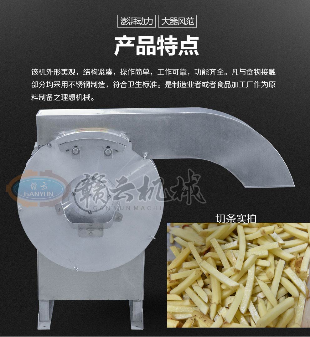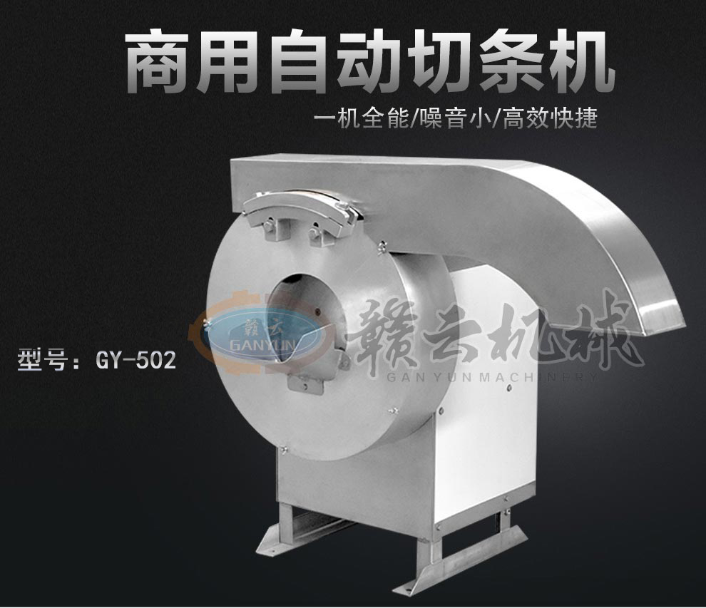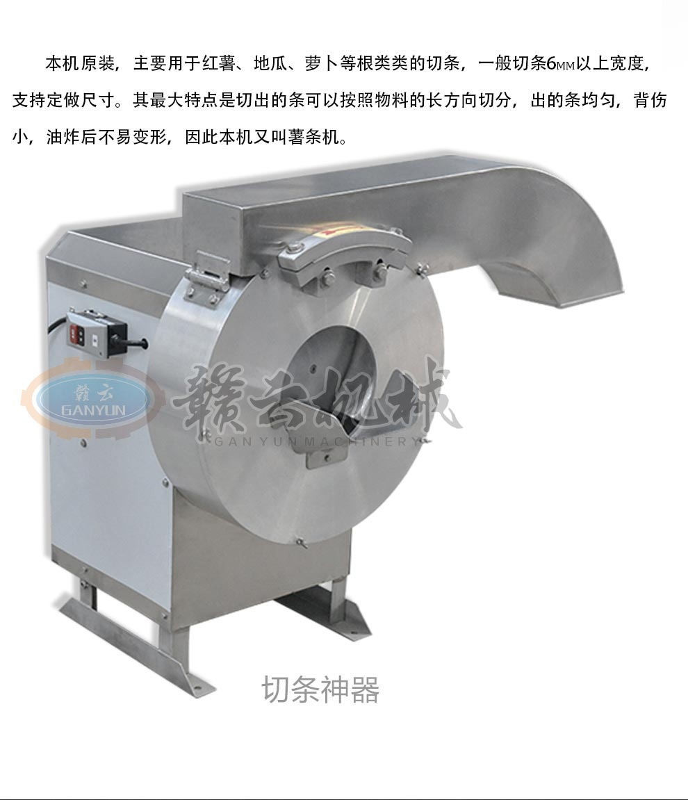 產(chǎn)品簡(jiǎn)介:GY-ST-502切薯?xiàng)l薯片機(jī)主要用于將塊莖類的果蔬切成片狀或是條狀,刀片采用優(yōu)質(zhì)不銹鋼材料制造,鋒利無(wú)比,使切削出來(lái)的薯?xiàng)l薯片表面光滑。本機(jī)操作簡(jiǎn)單,效率高,便于清潔。機(jī)器外部全部采用不銹鋼與鋁合金制造,所有與食物接觸的零部件均采用不銹鋼和鋁合金材料制作,主要用于薯?xiàng)l加工、酒店、餐飲店和相關(guān)的食品加工行業(yè)。