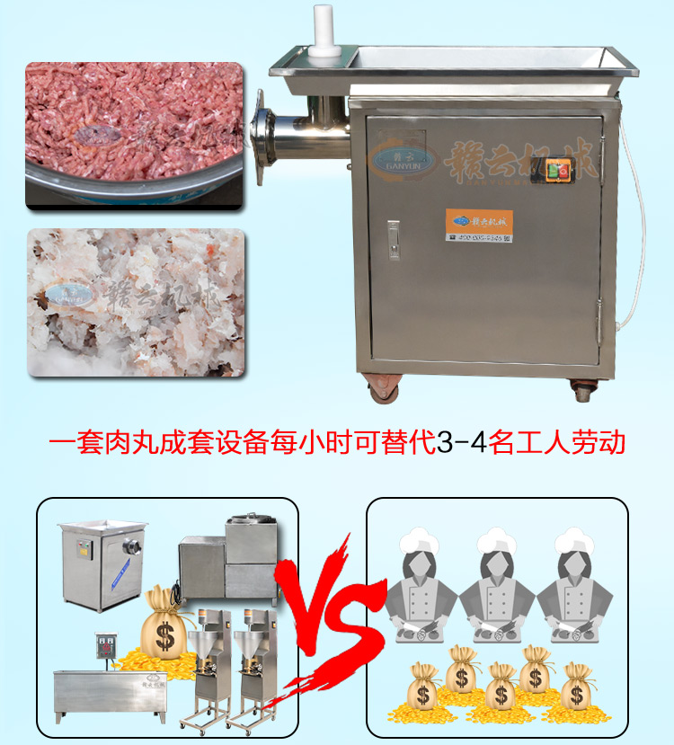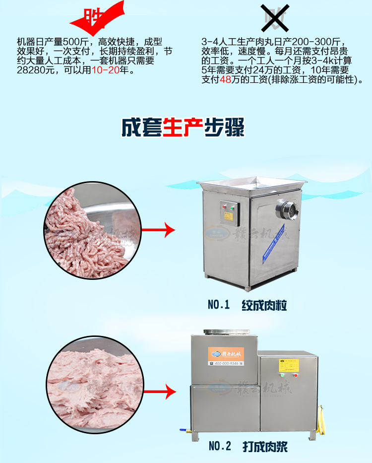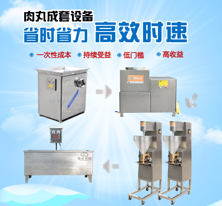 該套設(shè)備是生產(chǎn)500斤實心肉丸成套設(shè)備,一次性成本,持續(xù)收益,低門檻,高收益。3-4人人工生產(chǎn)肉丸,日產(chǎn)量200-300斤,效率低,速度慢。每月還需要支付昂貴的工資。而機(jī)器的日產(chǎn)量500斤,成型效果好,節(jié)約人工成本,一套機(jī)器可以用大概10年-20年。