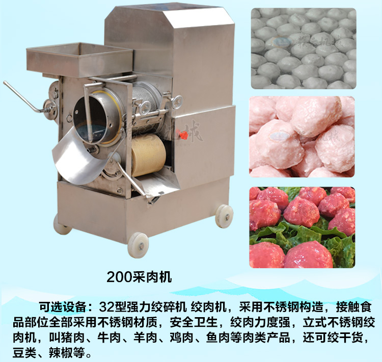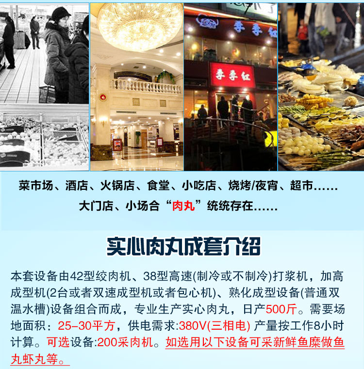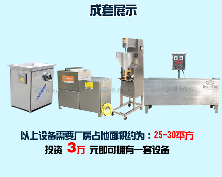 本套設(shè)備由42型絞肉機(jī),38型高速(制冷或不制冷)打漿機(jī),加高肉丸成型機(jī)(2臺或者雙速成型機(jī)或者包心肉丸機(jī))、熟化成型設(shè)備(普通雙溫水槽)設(shè)備組合而成,專業(yè)生產(chǎn)實心肉丸,日產(chǎn)500斤。需要場地面積:25-30平方,供電需求:380V(三相電)產(chǎn)量按工作8小時計算�?蛇x設(shè)備:200型采肉機(jī)。如選用一下設(shè)備可采新鮮魚糜做魚丸蝦丸等。