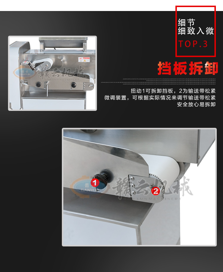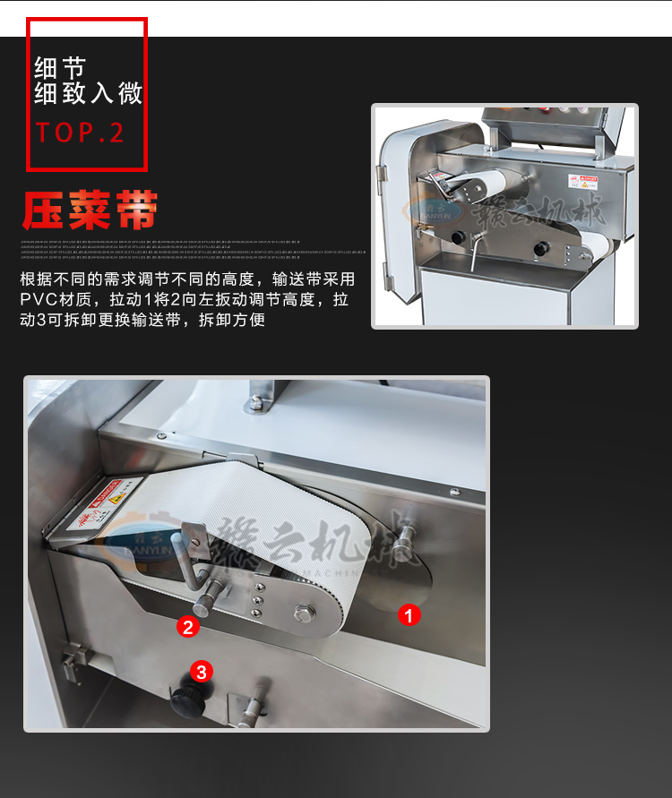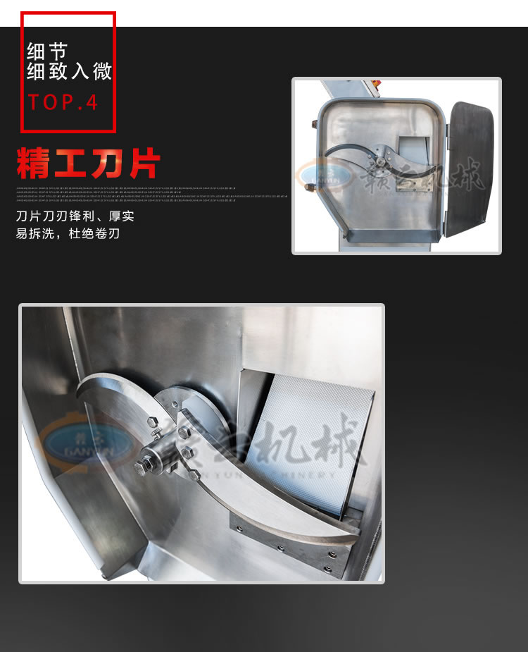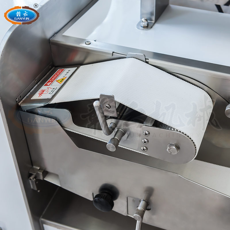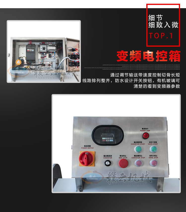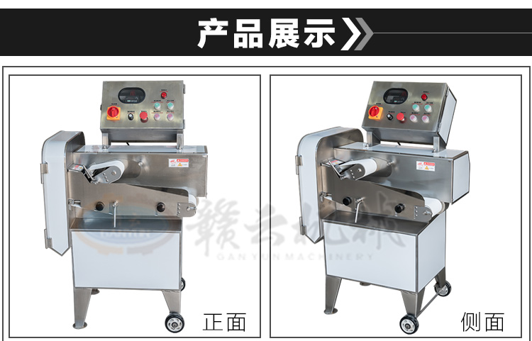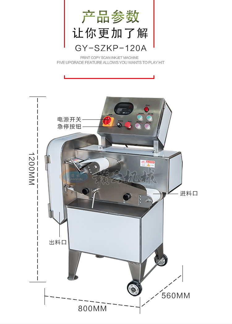 GY-SZKP-120A砍排機,優(yōu)質(zhì)刀片。通過調(diào)節(jié)輸送帶速度控制切骨長短線路排列整齊,防水設(shè)計開關(guān)按鈕,有機玻璃可清楚的看到變頻器參數(shù)。壓菜帶根據(jù)不同的需求調(diào)節(jié)不同的高度,輸送帶采用PVC材質(zhì),可拆卸更換輸送帶,拆卸方便。優(yōu)質(zhì)刀片,杜絕卷刃。機身背面散熱孔設(shè)計,電機運作時散發(fā)熱量,散熱孔設(shè)計更有效的保護(hù)電機的壽命,出料口傳感器設(shè)計,機器運作時打開刀盤門機器停止運作,安全穩(wěn)定,人性化設(shè)計。