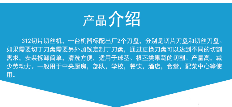 312型多功能切菜機(jī),切菜用什么好,什么牌子的切菜機(jī)好 312切片切絲機(jī),一臺(tái)機(jī)器標(biāo)配出廠2個(gè)刀盤,分別是切片刀盤和切絲刀盤。如果需要切丁刀盤需要另外加錢定制丁刀盤,通過更換刀盤可以達(dá)到不同的切割需求,安裝拆卸簡單,清洗方便,適用于球莖、根莖類果蔬的切割。產(chǎn)量高,減少勞動(dòng)力。一般用于中央廚房,部隊(duì),學(xué)校,餐飲,酒店,食堂,配菜中心等使用。