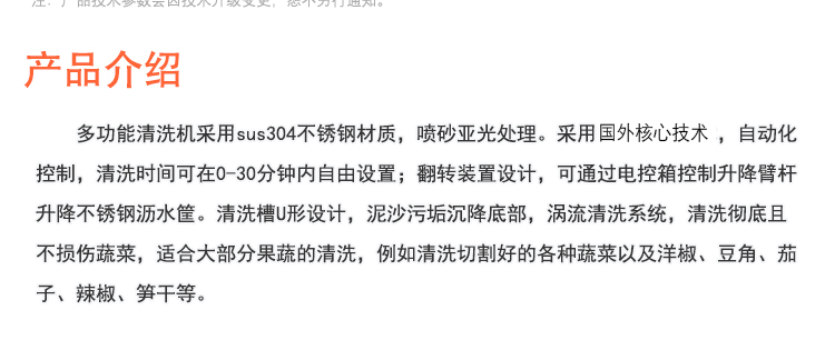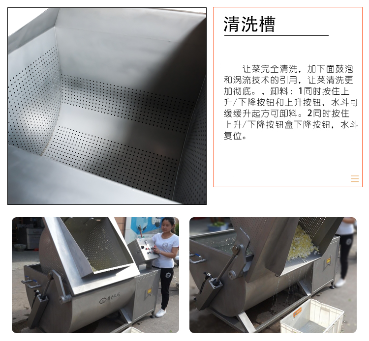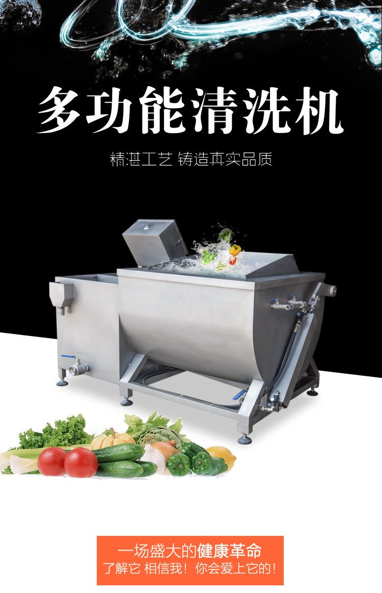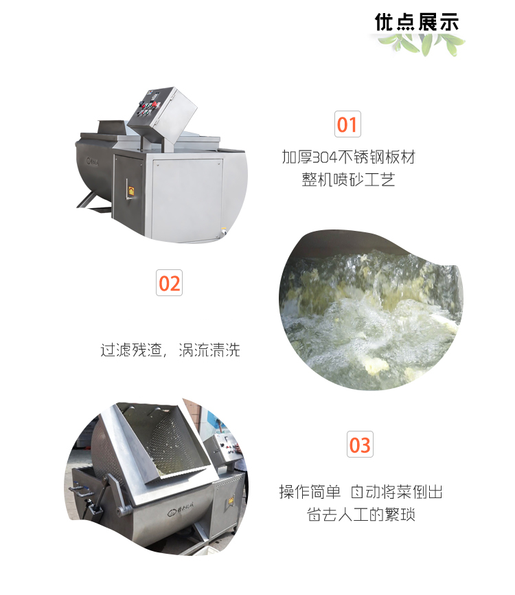 多功能清洗機(jī),采用sus304不銹鋼材質(zhì),噴砂亞光處理。采用先進(jìn)技術(shù),自動化控制,清洗時間可在0-30分鐘內(nèi)自由設(shè)置;翻轉(zhuǎn)裝置設(shè)計,可通過電控箱控制升降臂桿升降不銹鋼瀝水筐。清洗槽U型設(shè)計,泥沙污垢沉降底部,渦流清洗系統(tǒng),清洗徹底且不損傷蔬菜,適合大部分果蔬的清洗,例如清洗切割好的各種蔬菜以及洋椒、豆角茄子、辣椒、筍干等。