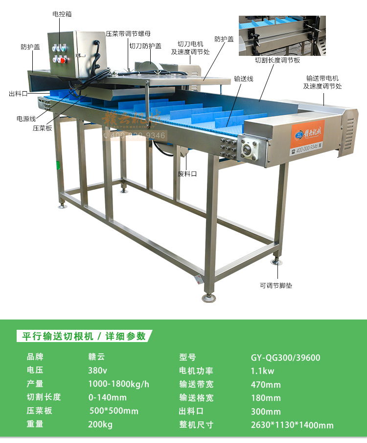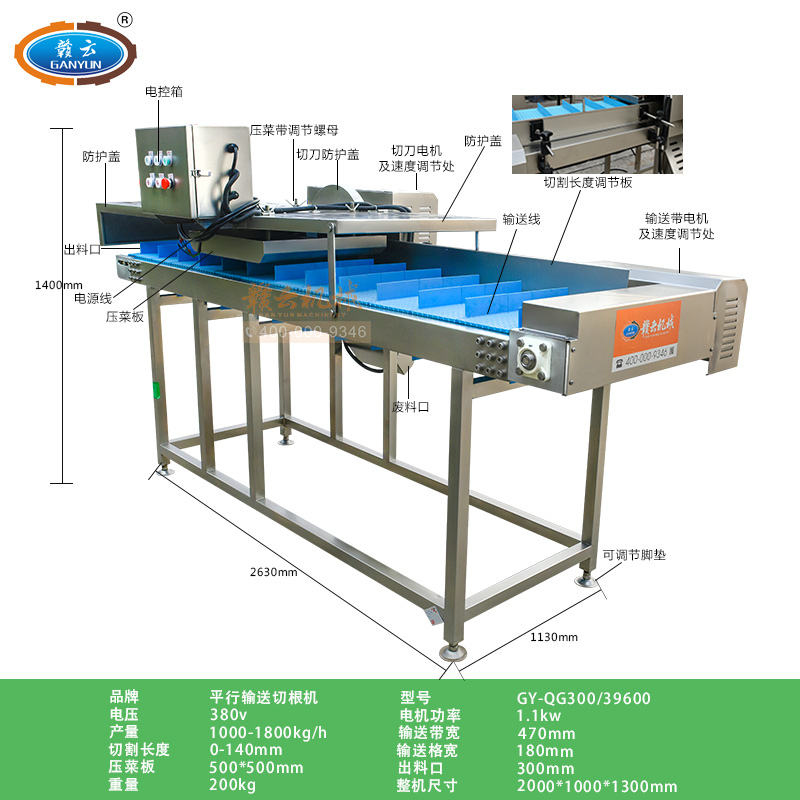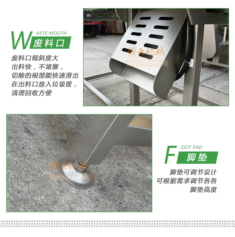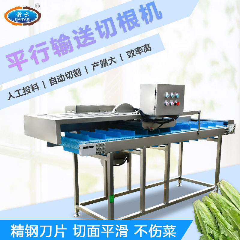 平行輸送去根機(jī)由輸送板帶動(dòng)物料前行,蔬菜經(jīng)過固定位置的刀盤后,蔬菜根部被切割從廢料口出來,保留的蔬菜則向前輸送。切割的長度可以調(diào)節(jié),每顆蔬菜所切割出來的廢料都相等。去根機(jī)適合大型食品加工廠、凈菜生產(chǎn)線等。