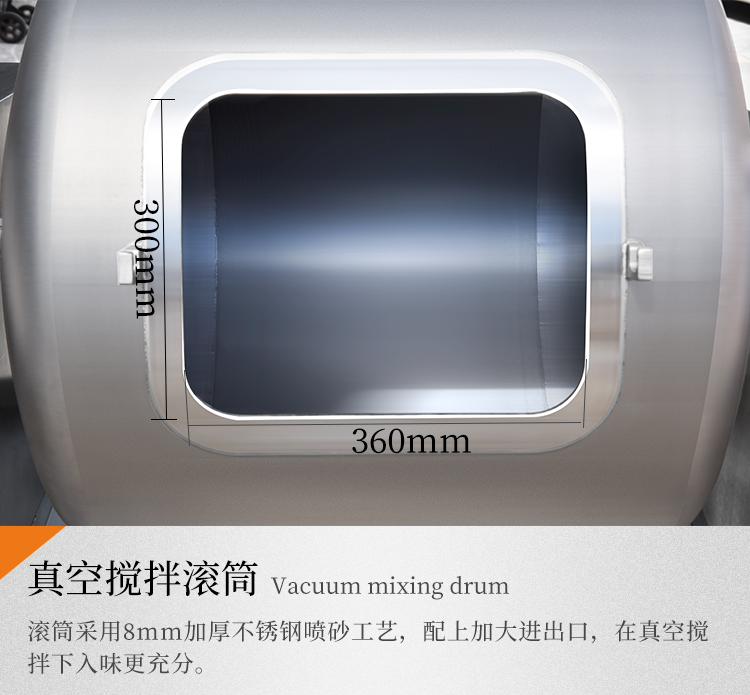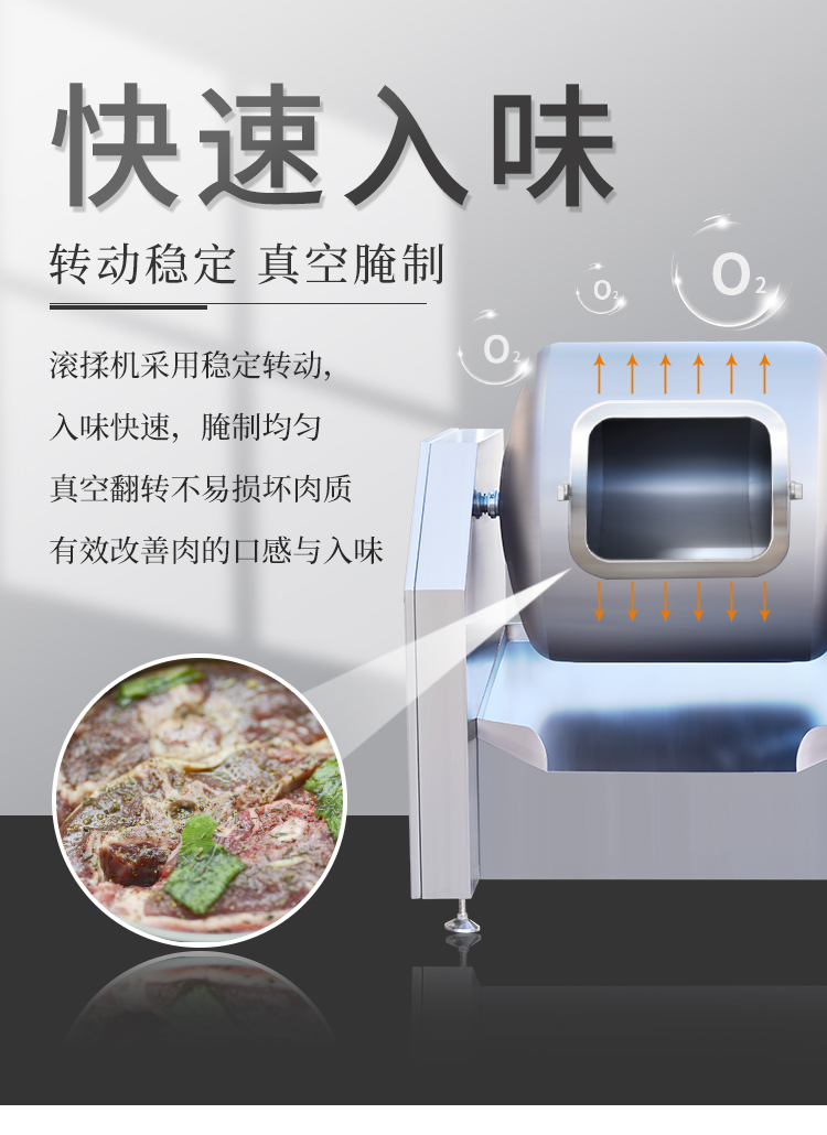 300升智能真空滾揉機,機器工作原理是通過滾筒快速滾動,讓筒里的肉料翻轉、撞擊、使肉均勻的吸收,快速腌制入味,使用真空翻轉是不易損壞肉質的,并且增加肉的結合力,提高肉的彈性,可以改善肉的口感更容易入味,讓肉料腌入骨,用真空滾揉機做美味。