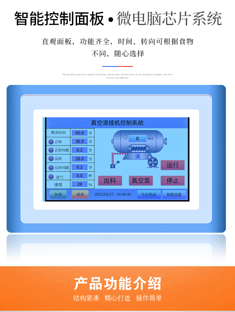 機器使用大功率電機,揉滾雙向轉動,采用不銹鋼機身,擁有智能控制面板,讓功能更直觀展示,時間、轉向可以根據(jù)食物不同,隨心選擇。