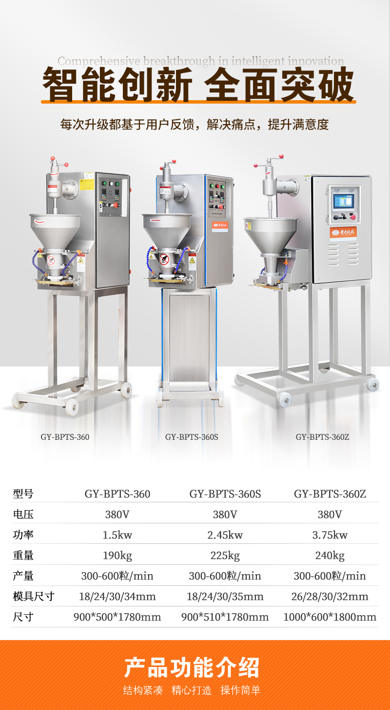 通過PLC智能控制系統(tǒng)與可調(diào)壓力螺旋裝置,快速成型魚丸、牛肉丸等多種丸子。