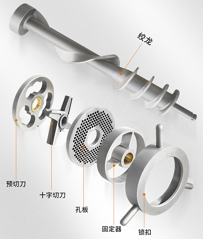 設(shè)備使用后的清洗工作也很簡單:先將出料口的鎖口松開,然后取下十字刀、孔板、預(yù)切刀、絞龍等配件放入清水池中清洗,使用熱水效果更佳。然后,用清水將入料口和出料口進行沖水清洗,將所有散落的肉渣沖洗干凈。
