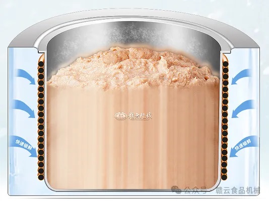 我們深知,肉漿在進(jìn)行高速制漿中,將會(huì)產(chǎn)生熱量,而熱量是食材鮮美與營(yíng)養(yǎng)的天敵。因此,冷鮮制漿機(jī)在繼承三速制冷打漿機(jī)優(yōu)良性能的基礎(chǔ)上,進(jìn)行了全面升級(jí),更加智能的溫控系統(tǒng),更加強(qiáng)勁的制冷系統(tǒng),更高效的冷卻循環(huán)系統(tǒng),更合理的熱傳導(dǎo)設(shè)計(jì)。通過(guò)即時(shí)帶走制漿過(guò)程中產(chǎn)生的熱量,全程讓肉漿持續(xù)保持低溫環(huán)境,有效避免肉質(zhì)升溫,還能抑制細(xì)菌的滋生,確保了食材純粹的鮮美與豐富營(yíng)養(yǎng)更好的保留。