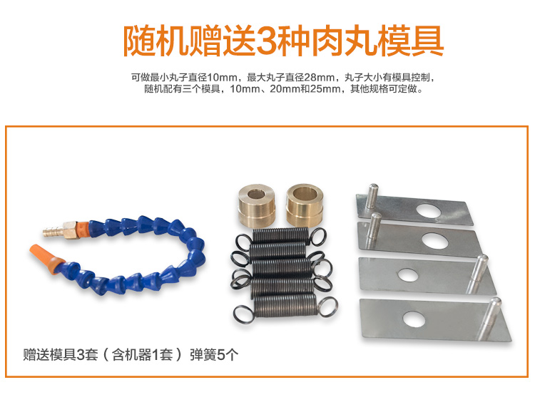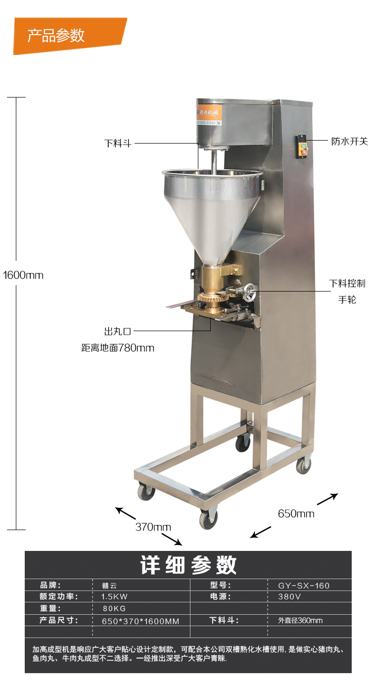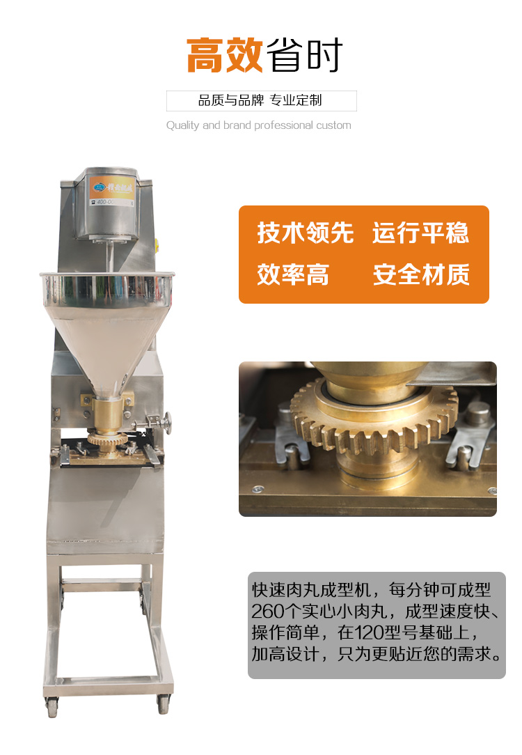 本款160型實心肉丸成型機是在120型實心肉丸成型機的基礎(chǔ)上加高設(shè)計,生產(chǎn)的肉丸具有密度小,圓度小,外表光滑等特點,深受客戶喜愛,適合餐廳、飯店、肉食加工廠使用,還會贈送您獨特的配方,肉丸成型機助您快速的占領(lǐng)市場。本款實心肉丸成型機是在120型實心肉丸成型機的基礎(chǔ)上加高設(shè)計,是配合我司設(shè)計的雙加熱水槽而設(shè)計,隨機配15、20、25MM三套成型模具,可做三種規(guī)格丸子,采用絞龍推料擠壓,切刀快速切割成型原理設(shè)計。隨肉丸成型機帶有詳細的操作說明。