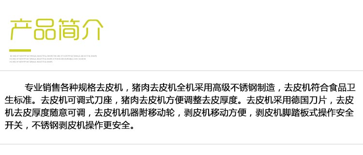扒皮機(jī)全機(jī)采用高級(jí)不銹鋼,符合國(guó)家食品衛(wèi)生標(biāo)準(zhǔn)�?烧{(diào)式刀座,方便調(diào)整去皮厚度。采用優(yōu)質(zhì)刀片,馬力十足,清洗方便,無(wú)需拆卸簡(jiǎn)單操作,輕松清洗,操作桿靈活自由變動(dòng),機(jī)器附移動(dòng)輪,撥皮更方便,腳踏板式操作安全開(kāi)關(guān)。不銹鋼撥皮機(jī)操作更安全,機(jī)器小巧靈便。