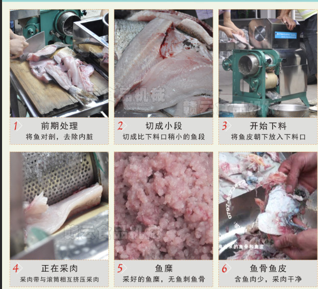 去刺是使用采肉機(jī)將魚(yú)體皮骨除掉而把魚(yú)肉分離出來(lái)。國(guó)內(nèi)使用較多的是滾筒式采肉機(jī)。